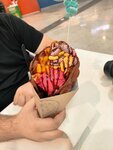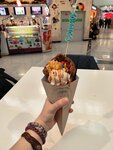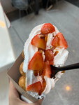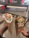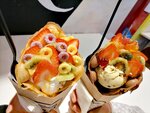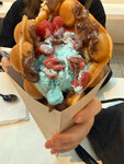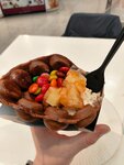 Встретились с подругой и очень захотели таких вафлей. Собрали на свой вкус. Ценник чуть выше среднего. Вафли пропечёные, но в некоторых шариках не было начинки, а в других шоколад не растаял и был кусочками.. Мороженое вкусное, фрукты вроде как свежие. Жаль что не было клубники, но было чем заменить. В общем и целом, рекомендую