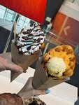 Свежие, вкусные вафли. Порция большая, доесть не смогла) Брали вафлю с начинкой и мороженым, мне показалось, что это божественно)