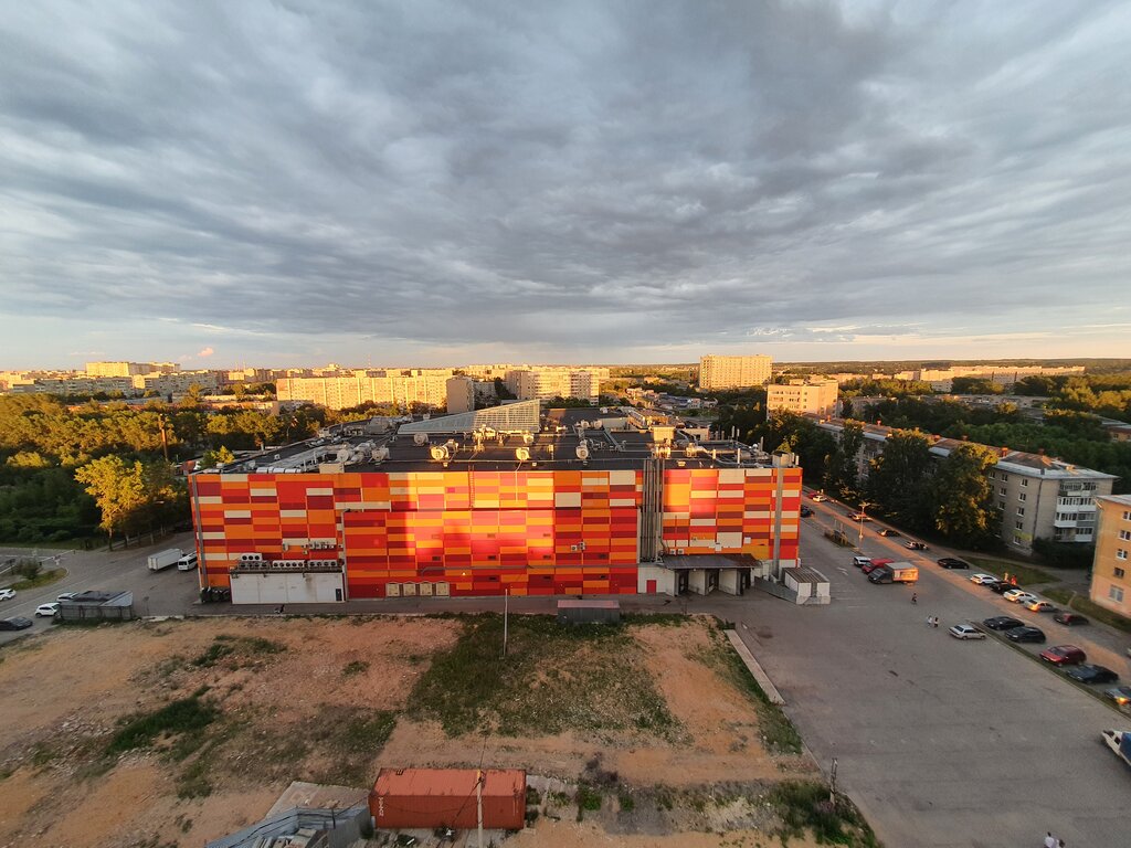 Удачное расположение (транспорт: конечная троллейбуса и др.; Товары: Мармелад) , оригинальная архитектура, огромная парковка.