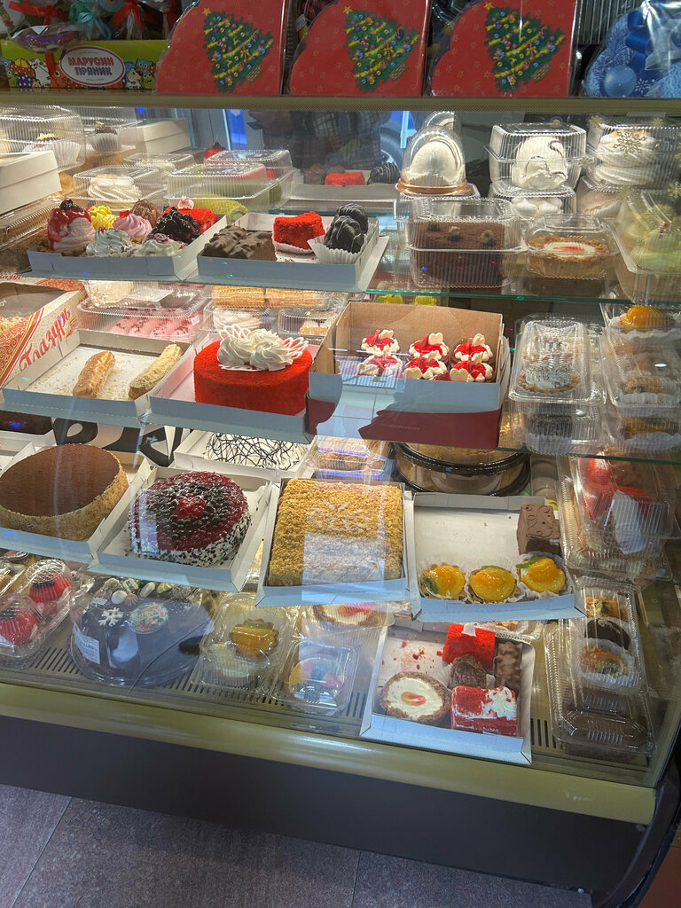 Постоянные клиенты Рахат 😊 Всегда огромный выбор тортов, пирожных, конфеток, трубочек и ещё много много сладостей. Так же есть всё штучки для поздравлений (открытки, шарики, свечи, конверты и т.д.). Так же очень круто, что можно написать на ватсап и уточнить про наличие тортиков или просто заказать их. Цены приемлемые. Всем советую. Вчера был ДР и мне подарили наивкуснейший тортик)) На фото он. Правда уже надкусан 😅