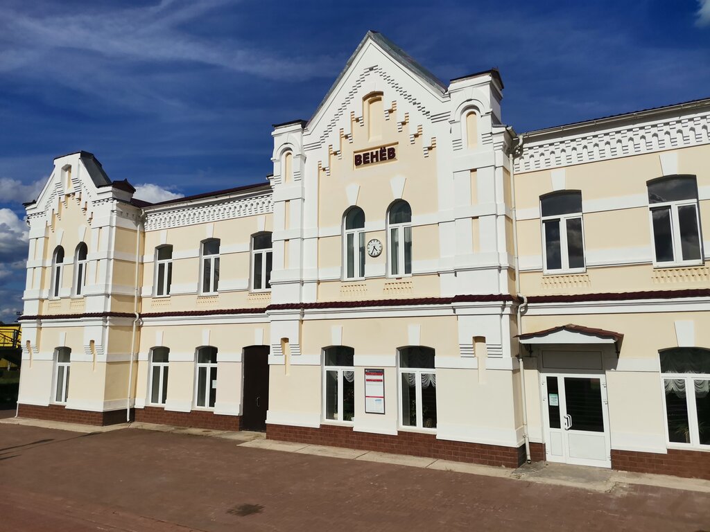 Отлично отреставрирован вокзал. Внутри филиал краеведческого музея, я имею в виду колоритное панно на стене, рассказывающее об истории древнего русского города и его знаменитых жителях. История у Венева действительно богатая, если сама Екатерина Великая приложила ручку к созданию герба города. В здании вокзала очень уютно, не хочется уходить, скамейки с названием города, портьеры как в театре, класс! Мне очень понравилось!