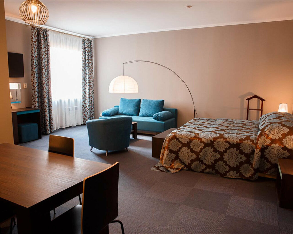 Двухкомнатный номер "Люкс" повышенной комфортности оснащен современной удобной мебелью и кондиционером. В номере отдельная гостиная. К вашим услугам мини-бар, холодильник, набор посуды и чайник