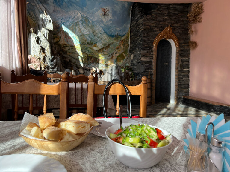 Это какая то параллельная реальность. Грязь, я даже разуться там не смог и спал в одежде. Слишком устал и пришлось здесь остаться. Заказал еду, принесли хинкали непонятно из чего, 80% теста и пиво владикавказское "Дарьял" по 150р., которое в магазинах стоит 50р. Бабушка и дедушка вроде и милые но на деньги падкие и немного странные