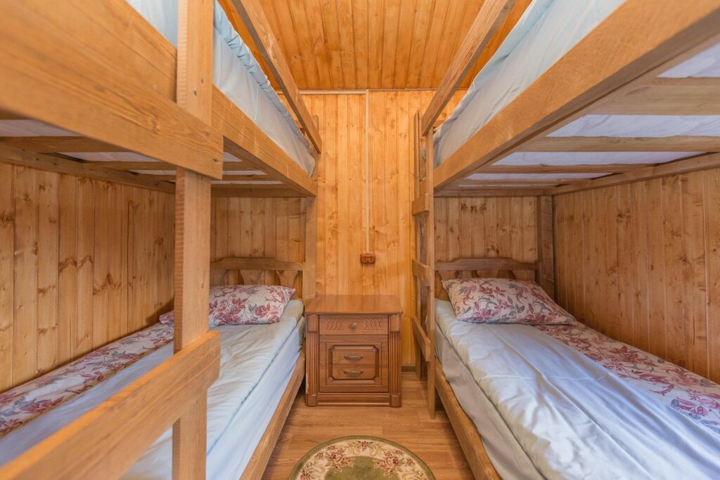 До канатки 15 минут на машине. В домиках тепло, даже очень. Из посуды: сковородка, 2 кастрюли, тарелки, кружки и столовые приборы. Бельё чистое и свежее. Единственное что является минусом, это шумоизоляция, если в соседнем домике или на улице шумная компания, то слышно, как будто она у вас на кухне. Но это, я думаю, проблема всех домиков. Парковка на территории участка. На территории есть мангальная зона. И главное, в домике чисто: паласы, на которые не противно стать, накидка на диван, двери, посуда... Всё чистое.