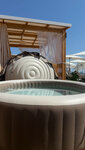 В Пляжном комплексе " Рай" , "Приморский пляж 1" я провела 2 дня. Мне здесь понравилось больше, чем на пляже Приморский 2 : цена лежака под зонтом на 100 руб выше, чем на Приморском пляже 2 - 1300 на день, но ... можно менять лежак , уходить и приходить, зато есть туалет и кафе, что для меня важно, комплекс более солидный, есть платные джакузи , кабинки, пуфы , можно взять в аренду камеру хранения и полотенце, души, кабинки для переодевания. Когда жарко, можно пройти в кафе там же , где всегда ветерок, уютные диваны с видом и прекрасное меню. Завтракала здесь ( завтрак с 10 до 15 ) и обедала. Вкуснейшая паста Арабьята. Коктейли и еду можно заказать прямо с лежака, просто отсканировав куар код. Классное место. Есть сап станция и спасатель . Единственный минус- вход в воду с 1 стороны очень сильные камни и сразу волнорез , с другой стороны лучше, но там толпа купающихся детей и много людей просто лежит у воды на полотенцах. Беда всех платных опций- лежишь на шезлонге в 1 линии, а впереди обязательно стоит много людей, причем практически под твоим зонтом)) тк отдельного большого пляжа без лежаков нет и им тоже нужно отдыхать) . Но со стороны с плохим входом в воду таких стоящих почти нет , поэтому вид на море и кораблики , ветерок и под зонтом +30 не ощущается, только море , счастье и солнце! Большой выбор напитков . Для меня было все оптимально. Не хотелось бегать в жару по набережной в поисках обеда и завтрака и этот комплекс меня устроил . Приятно, что блюда при подачк были украшены цветами. Благодарю ребят!