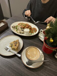 The nearest cafe with breakfast is open from 8:30. The interior is pleasant, the girl behind the counter is friendly. The menu is not big, but the prices are nice. There is a showcase with cakes and other goodies - they look delicious. We ordered: Oatmeal porridge - a huge portion, porridge balanced in salt and sugar, with fresh bananas and grated chocolate, delicious and satisfying. The omelet is a decent portion, but my husband did not appreciate the taste of the oil (apparently they are not cooked with standard sunflower oil). The cheesecakes have a slightly unclassical taste with rice flour, but I liked them. Latte is not bad. In general, we were satisfied - they fed us very promptly, we recommend you to visit.