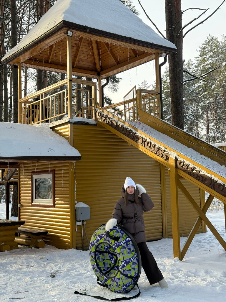 Большая территория, всё очень красивое. Детская площадка новая. Жаль музей сгорел, но рядом есть немного экспонатов на которые дети идут смотреть и можно посидеть на мотоциклах. Когда становится темно всё как будто становится по-новому, всё в гирляндах и множестве разных лампочек, в общем красиво особенно в темное время суток. В домике чисто, красиво. Отдельно понравилось что сауна входит в стоимость домика и вход в сауну прямо из домика, за это прям респект👍есть своя мангальная зона и беседка и весь домик огорожен забором что добавляет ещё больше комфорта. Нам очень понравилось и обязательно приедем ещё 👍