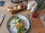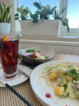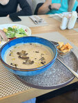 Была здесь на обеде, поэтому скажу о личном опыте. Возможно вечером все на пять баллов, но днём не дотягивают. Начнем с плюсов - все блюда которые мы заказали были вкусные. Комплексный обед большой - у нас был плов, солянка, салат, напиток, хлеб и кекс. Его принесли быстро. Но я не ищу легких путей и заказала по меню. Грибной суп и салат с уткой вообще без претензий. Подружки тоже по меню взяли салатики сказали вкусно. Из минусов по сезонному меню ничего не было в наличии ( зачем предлагать не понимаю) и подача блюд была 30-40 минут - считаю это очень долго (для супа уж точно). Когда мы пришли зал был грязный, все свободные столы не убраны. Могу понять боль сотрудников, обеденное время это сложно, но как говорится хочешь клиентов - умей вертеться. Официант не понравился (немного грубоват, посадил за не убранный стол потом нас всех поднимал что бы убраться, короче не уровень ресторана). По ценнику для обеда дороговато ( ну как бы если вы идёте в ресторан, надеюсь вы на это и рассчитываете). В общем комплекс вроде 470, по меню салат и суп 1100. Интерьер для ресторана очень простенький, но вроде у них какая-то супер терраса надеюсь там получше. В общем не топ, но норм.