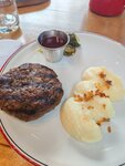 Большая сочная говяжья котлета с ягодным соусом и картофельным пюре