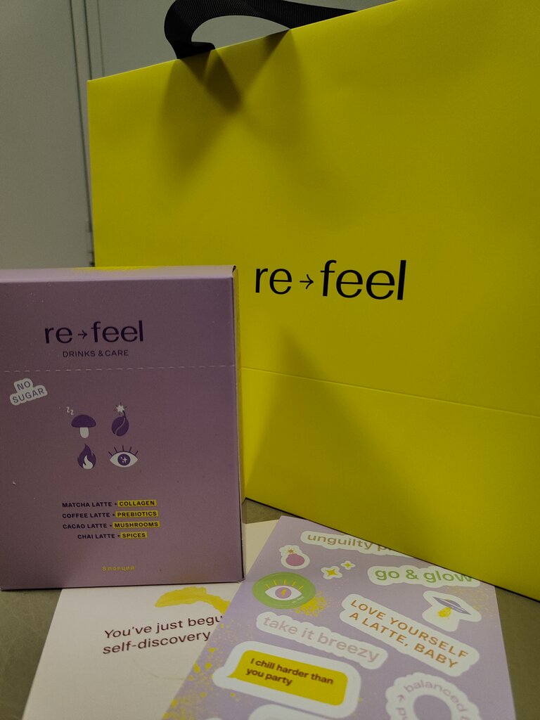 Обожаю напитки от re-feel 😍 их дизайн и концепция 1000/10! Очень вкусный кофе и матча! Так же понравились саплименты для энергии с манго и для релакса с малиной 🤌🏼