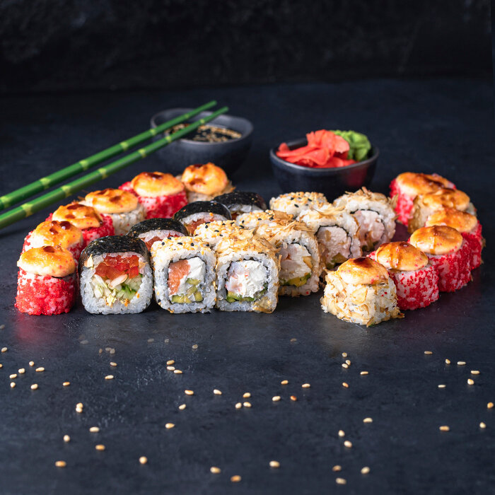 Variety of food:sushi and rolls, pizza, fixed meal, сhinese food