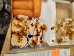 Доставка в течение 1.5 часов это единственный+. Суши с лососем норм, а вот ролл Филадельфия ужасен из-за прогорклой рыбы, которая явно потеряла свежесть уже давненько(отвратительное послевкусие рыбьего жира🤢) С гунканами совсем непонятно..... Так и не поняли по вкусу где с креветкамт, где с крабовыми палочками и где с лососем, т. е. все на один вкус - вкус крабовых палочек и снова рыбьего жира. Соевый соус впечатлил((((-такое чувство, что бутылку помыли и остатки вылили для доставки, васаби вообще ни о чём.Вывод: больше заказывать не будем, т. к. не вкусно и не стоит потраченных денег. В каком виде привезли сможете оценить по фото.