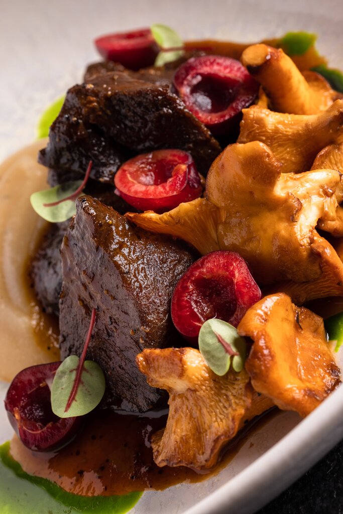 Томленая щека телячья с орзо и муссом из пармезана
