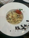 Это был восхитительный обед!!! Просто невероятно вкусно! При заказе нас предупредили, что готовность одного из блюд - минут 35, мы не спешили, поэтому согласились. По факту всё было готово намного раньше, действительно быстро всё приготовили. По вкусу - просто космос! Заказывали: грибной крем-суп, фетучини с морепродуктами, сковородку со свининой, чизкейк, хлеб и чай. Даже не знаю что больше понравилось, суп - отличный, я люблю грибные супы, поэтому есть с чем сравнивать, один из лучших, что я пробовала! Фетучини тоже очень вкусные, много морепродуктов и соуса! Ещё хлеб очень понравился, точно не знаю, но думаю, что пекут сами, очень вкусный, подали ещё теплым. В целом - низкий поклон всем сотрудникам!!! Однозначно советую к посещению!!!