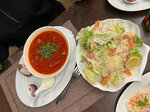 Не вкусный борщ, с заветрившим хлебом и засохшим салом. Вкусный салат цезарь с креветками. Оплата налом или переводом. Очень не удобно, нет скидок для гостей отеля .
