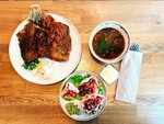 Здесь, в отличии от предшествующей Моремании тоже специализируются на морепродуктах, но при этом еще и дорожат своими гостями. Заведение занимает первый этаж небольшого здания и работает с 10 утра до 22 вечера. В кафе возможно не только обслуживание в зале, но и приобретение охлажденных деликатесов, соленой и копченой рыбы собственного приготовления. При входе сразу улавливается этот ненавязчивый, манящий и узнаваемый дымный аромат копчения. Окружила нас своим вниманием официантка Лидия, заказ она повторила, уточнила совместный или раздельный счет, предложила дополнительные соусы к выбранным позициям, владела информацией о составе и характеристиках блюд, разливала напитки и вовремя убирала грязную посуду. Оформление лаконичное. Внутри - один продолговатый и просторный зал с высокими потолками. Справа расположены черные диваны, рассчитанные на 4 гостей; бежевые, находящиеся по центру, вмещают 6 человек. На панорамных окнах — светлые гардины. Черные и белые светильники создающие ритмичную композицию над рядами деревянных столов, стоящих по струнке. Очень много света, из-за стеклянного прилавка, который совместно с барной стойкой тянется вдоль всего зала, слегка виднеется открытая кухня. В меню множество позиций, присущих ресторану с морским уклоном: гунканы, роллы, мидии, жареный рис с различными добавками, несколько видов пасты, супы, салаты и горячие блюда, в том числе приготовленные на гриле. Есть еще раздел с завтраками, но, на наш взгляд, он несколько обыденный, поэтому мы полностью настроили свои рецепторы под морепродукты. Кухня с нашим заказом справилась быстро, буквально за десять минут. Порции среднего размера. А какие здесь привлекательные цены! Цельная зажаренная камбала, которую мы выбрали самостоятельно, стоила 625₽, том ям - 595₽, оливье с лососем - 480₽. В общем, даже при ограниченном бюджете здесь можно порадовать себя чем-то вкусным, чего не будешь готовить дома. В отличии от некоторых других заведений Москвы и Подмосковья, здесь ровно в 10 утра уже вовсю работала кухня, полностью был готов зал с натертыми до блеска столами и витринами, а все позиции меню были в наличии. Приятно, что не пришлось ждать опаздывающего повара или что-то в этом духе, а то мы с чем только подобным не сталкивались. Спасибо, что вы заботитесь о своих гостях, уважаете их время и вкусно кормите не по космической цене!