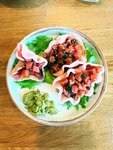 Баклажаны, шпинат, салат айсберг; салат рукола, соус свит чили, сыр творожный, помидор, кунжут