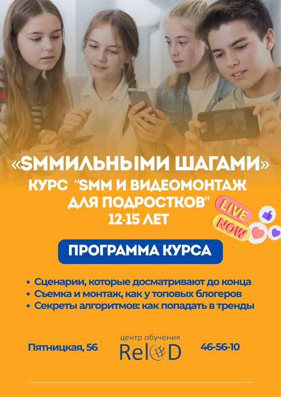 Дочь посещала курс "С камерой на Ты!" Ходила с удовольствием, узнала много нового. Коллектив небольшой, до 8 человек, удобно заниматься, интересно. После каждого занятия выкладывали фото и видео, чему научились ребята и чем занимались. Для оплаты части курсов мы применили сертификат пфдо. Все было понятно, сотрудниеи отвечали на любые вопросы. Предложили сходить на елку от Релод, поучаствовать в конкурсе новогодних поделок. Минусов никаких я не заметила.