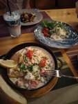 Потрясающее место! Если Вы хотите вкусно поесть, атмосферно посидеть на берегу моря и насладиться чудесными видами, и при этом не переплатить - то однозначно Вам сюда! Мы были наслышаны про этот ресторанчик, читали много положительных отзывов. Поэтому когда приехали отдыхать в Новый Свет - хотели поужинать тут в первый же день. Но! Место довольно популярное, поэтому тут надо заранее бронировать столик. Забронировали на следующий вечер, места были. Кстати, на выбор предлагают или столик, или топчан - на ваше усмотрение. Мы брали салат с морепродуктами, сковородку с рыбой, сковородку с рапанами, коктейль и глинтвейн. Все очень вкусно, кстати шеф-повар готовит все при вас на открытой кухне! Мне очень понравилось сочетание красной и белой рыбы, морепродуктов и цуккини в сковородке, на мой вкус- картофель дольками немного утяжеляет блюдо. Соус насыщенный, ароматы -вау! Глинтвейн также очень нам зашел! Обслужили нас быстро, отвечали на все вопросы по меню, интересовались обратной связью - было ли нам вкусно. Молодцы, ребята, так держать!