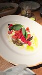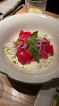 Сладкий перец рамиро, дополненный пряной специей шичими, чесночным маслом, свежим хреном, пикантными каперсами и соусом вителло тоннато из анчоусов