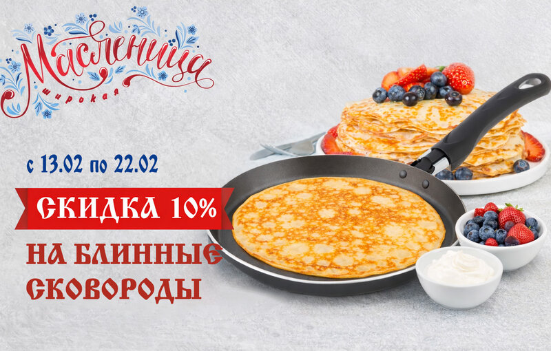 Обновите главный инструмент для Масленицы в магазинах "Реванш". Скидка 10% на блинные сковороды с 13 по 22 февраля 2026 года. В ассортименте...