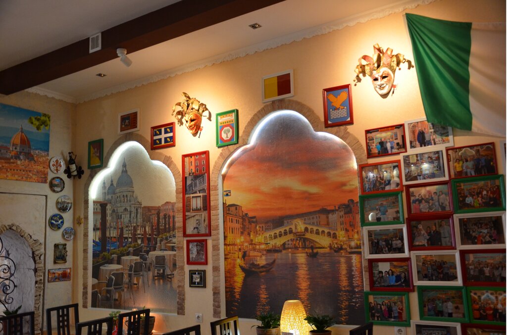 Вообще, когда заходишь, вроде ничего необычного. Но в процессе поедания "цезаря", приходишь к выводу что обстановка на самом деле иная. А началось с картины на стене. На ней умиротворенность и плавающие лодки. Затем фокус сменился на одну из карнавальных масок и она чем то зацепила, а там ещё одна рядам и поотдаль ещё одна. "Какие необычные" подумал я запивая "цезарь" эспрессо. Маски, вино в углах, картины, и общий фон действительно создали атмосферу возможно похожую (Я пока что лично там не был, но это пока)) на итальянскую, что в целом очень контрастирует с апрельским настроением северного Байкала... Короче прикольно. P. S. Салат вкусный на 4. Кофе стандарт. Официант молодец. Скорость приготовления тоже нормально.