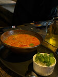 Вежливый персонал, оформление зала - шикарное, туалеты - чистые. Единственное что, было немного холодно, но вынесли пледик, так что не стоит заострять на этом внимание. Очень вкусный тыквенный суп! А десерт манго призываю попробовать каждому. Мы также брали десерт "Ribs" (вроде он так назывался) , это муссовое пирожное в форме человеческого сердца под скелетом из меренги, подача конечно - бомба. На фото ещё тар-тар из говядины, обычный, хороший. И рыжики солёные, собственно тоже обычно и вкусно)