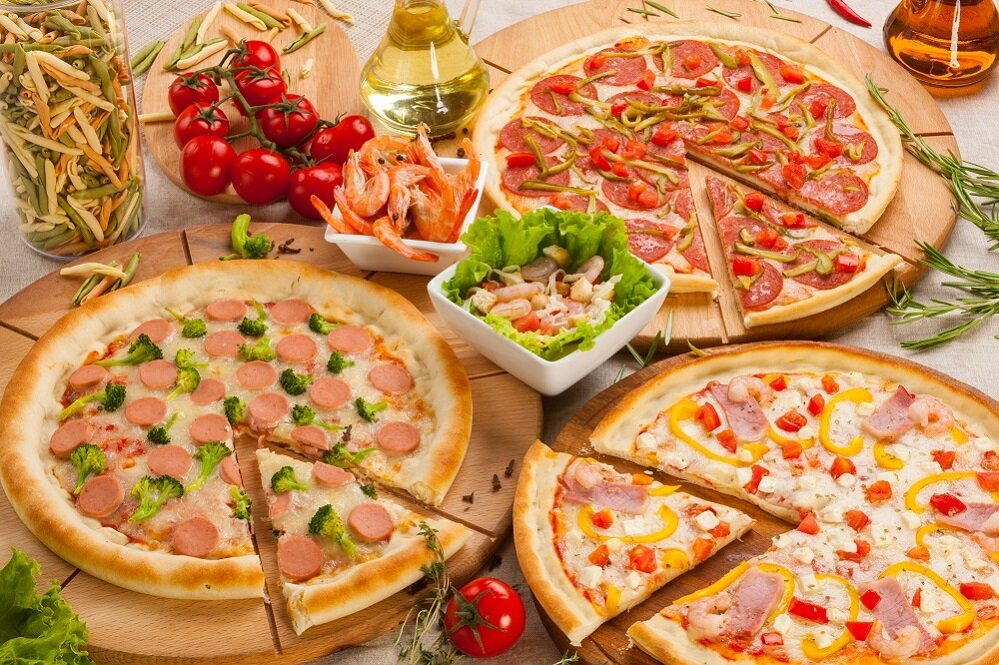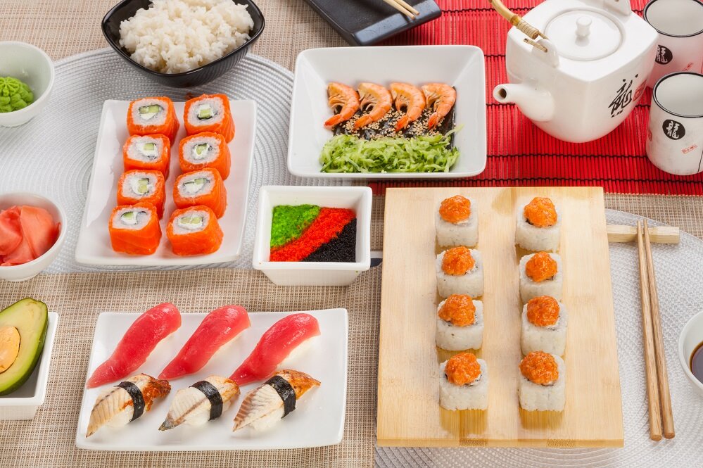 Variety of food:sushi and rolls, pizza, сhinese food