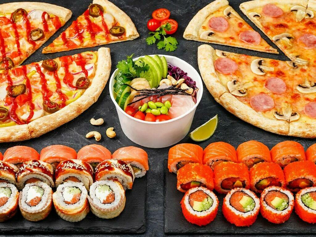 Variety of food:sushi and rolls, pizza