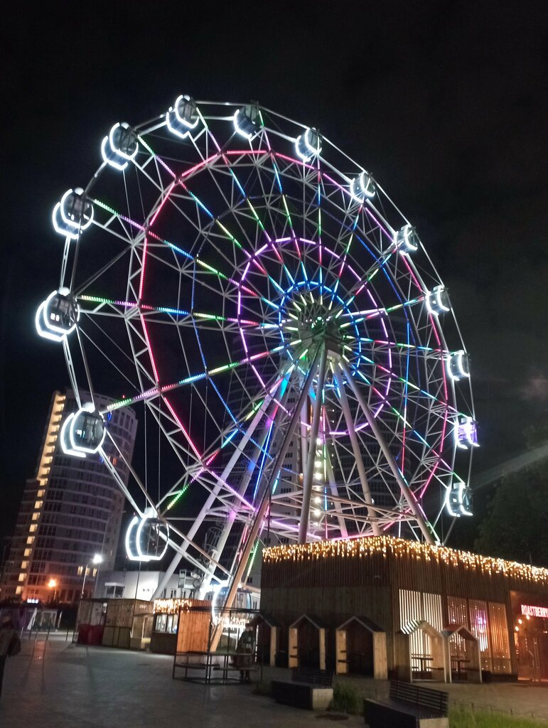 Обзор с колеса обозрения не сильно восхищает: заволжскими далями и волжским откосом Нижнего Новгорода интереснее любоваться из кабинки канатной дороги, а вид ржавых крыш города безрадостен. Кремля практически не видно. В кафе вкусный кофе. Есть туалеты. Главная фишка - робот-продавец мороженого Дуняша. Минусы: туалетов мало для больших туристических групп, дороговато.