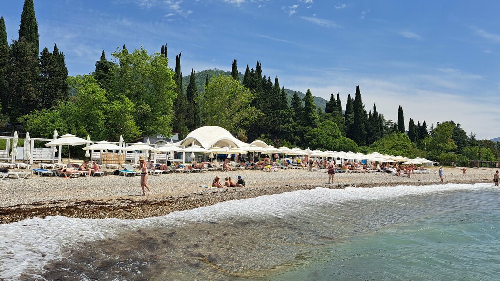 A good beach is free from several Rodina hotels, a waterfall and some others. The territory is clean, sun beds with umbrellas, staff, licensed water activities, there is a cafe on site. I liked. The sea was beautiful, warm and clean. The shore is a medium-sized pebble, we swam in slippers. Have a good rest, everyone. I also liked the Waterfall hotel, good rooms, the territory and the buffet food are good, breakfast and dinner.