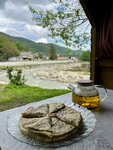 Если проезжаете рядом - заезжайте. Решили попробовать хычины и взяли по одному каждого вкуса, а они весьма интересны: с мясом, сыром, крапивой и мятой, картошкой, свекольной ботвой. Мой фаворит с картофелем, хотя все вкусные. Готовят сразу для вас (за стойкой с оплатой сразу и стол для раскатки теста/готовки). Чай травяной сбор так сильно понравился, что спросили у девушек где купить, так нам с собой немного насыпали. Спасибо им! Ну, а вид на реку при чаепитии - одно удовольствие. И да, недалеко находиться источник с питьевой водой - берите с собой бутылки)