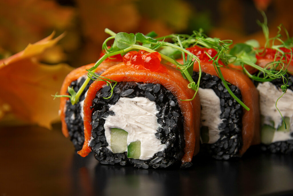 Филадельфия классическая с атлантическим лососем, Калифорния с отборной креветкой, Филадельфия в кунжуте с атлантическим лососем, Тейшоку ролл с пикантным соленым огурцом, Нагато ролл с атлантическим лососем, Конан ролл с сырной шапочкой, Запеченн...