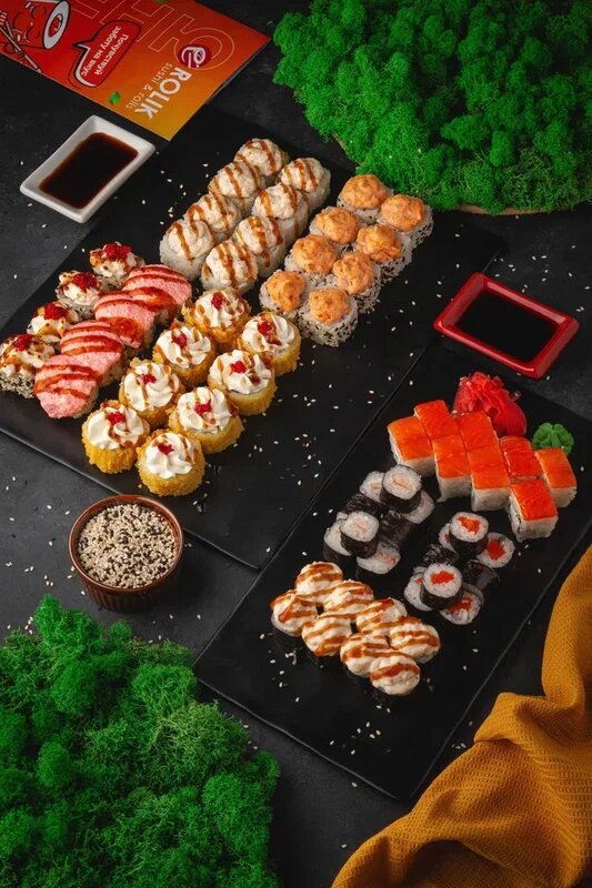 Филадельфия классическая с атлантическим лососем, Тайбей ролл с сочным крабом и сырным соусом, Конан ролл с сырной шапочкой, Запеченный Инь-Янь ролл с сочным крабом и фирменным муссом, Жареный Лишуй ролл с аппетитной курочкой *Имбирь, соевый соус...