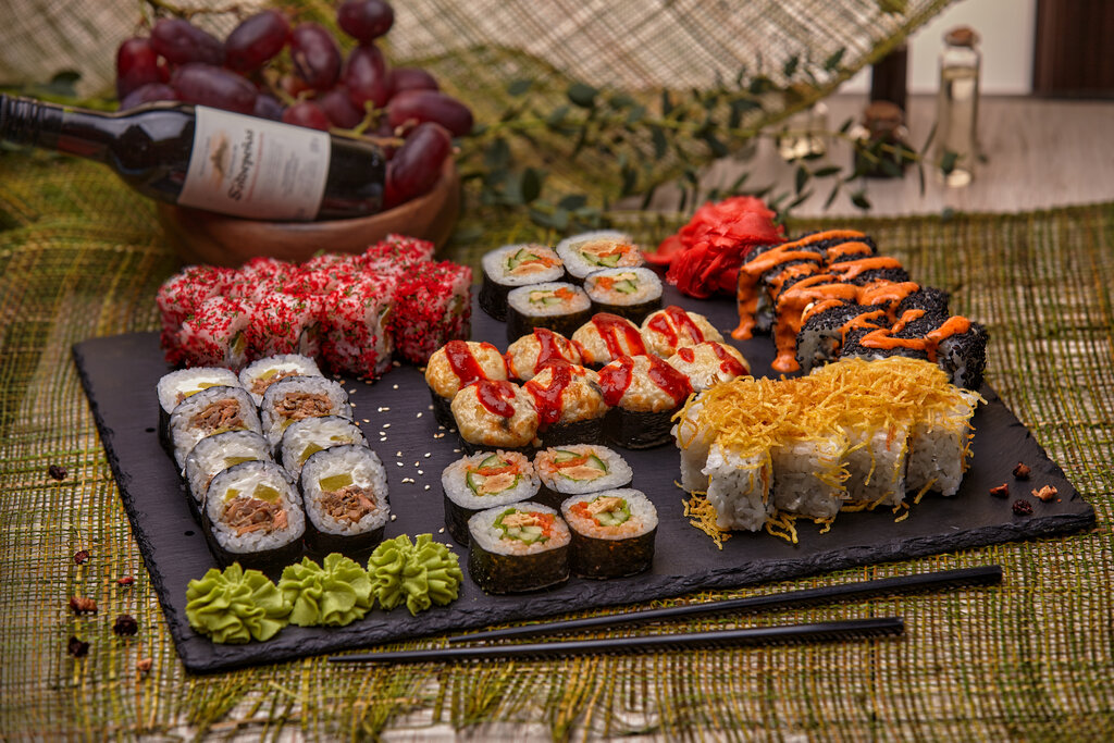 Variety of food:sushi and rolls