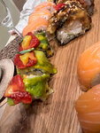 Рис, нори, сыр филадельфия, лосось опаленный, камчатский краб, угорь, авокадо, унаги соус, спайси соус, лук зеленый