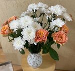 Состав: роза кустовая, хризантема кустовая, декоративная зелень,упаковка дизайнерская,лента