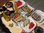 Калифорния классик (8 шт.), Лосось гриль (8 шт.), Запеченные классические под чесночным соусом с мидиями (8 шт.), со свининой (8 шт.), с крабом (8 шт.), с лососем гриль (8 шт.), с огурцом (8 шт.), с тунцом (8 шт.), соевый соус, имбирь, васаби