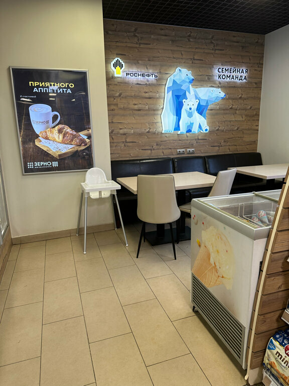 Регулярно заправляюсь на этой заправке. Цены одни из самых низких, а качество обслуживания высокое. Всегда с удовольствием покупаем здесь сопутствующие товары, кофе, мороженое. Очень уютно за столиками у окошка рядом с семейством белых медведей на стене)