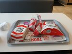 Ну что сказать, был тут в кфс 5 лет назад все было здорово. Сейчас же отдача заказа долгая, поднос грязный, на нем какая-то харча, почему нет салфеток.Еда холодная... нагнетцы не вкусные, позожи на "красную цену" с привкусом картона. Вообще не впечатлило, соуса мало, еда сухая. Качество опустилось, обслуживание так себе. 1 звезда, не рекомендую.