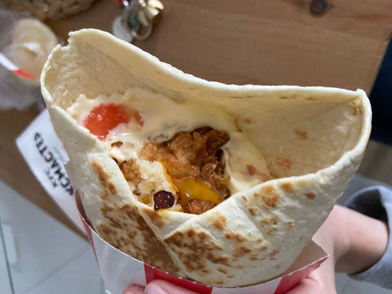 Время ожидания составляет 5-10 минут. Много это или мало - сказать сложно, но для меня приемлемо. Довольно чисто, готовят в целом вкусно. Но есть один нюанс. Живу я в этом районе и часто после учебы и работы могу зайти в кфс, взять что-то перекусить после тяжелого дня. И не первый раз, приходя домой, обнаруживается, что начинки явно не доложили. Но сегодня эта история какого-то удивительного уровня. Не положили ПОЛОВИНУ начинки в твистере с креветками. Там и так по стандарту вряд ли больше 3-4 креветок на весь ролл кладут, а стоит он ощутимо дороже остальных. Но на весь ролл по итогу оказалось две креветки. Просто половина ролла пустая, один лаваш… Больше сюда заходить не буду. Платить деньги за пустоту вместо еды - бред
