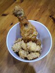 на фотографии содержимое "ведёрка", в котором должно было быть две ножки, несколько стрипсов (совсем не положили) и в два раза больше кусочков) - и это почти регулярно (но вот так нагло и много - первый раз)!