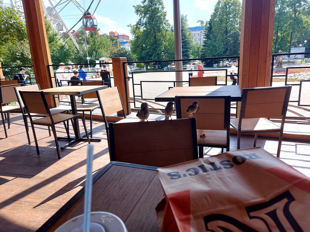 Данное заведение быстрого питания, в целом по стандартам похоже на многие из сети, каждый уникален по своему, но всегда есть понимание в какое заведение ты попал. Сотрудники приветливые и приятные. Есть удобная веранда с выходом и видом на парк, в хорошую погоду хороший вариант, если вам все равно на надоедливых, там птиц. Ещё из минусов мало кабинок в уборной. А так в целом, если вы любите курицу неплохое заведение. Можно быстро и вкусно перекусить.