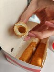 испортили весь день! дети с самого утра на соревнованиях, ближайший фастфуд - этот. при заказе не было никаких уведомлений, что товара (сырных палочек) нет в наличии, поэтому заказ засчитался, показывало, что он готовится, но задерживается, из-за чего было потрачено лишние 20 минут времени. других людей подозвали, сказали, что можно заменить товар. в итоге двум девочкам в разных заказах принесли такие сырные палочки, как на фото, они пустые, кроме одной, где половина её была с сыром, но сыр как будто залежавшийся, + чересчур солёный. другой девочке не дали бургер, пришлось подходить разбираться. в ролле один из трех куриных стрипсов отвратительная, как будто резиновая из хорошего только картошка по деревенски персонал не коммуникабельный, в уборной, кажется, убираются далеко не по графику в общем, ужаснейшее место ☺️