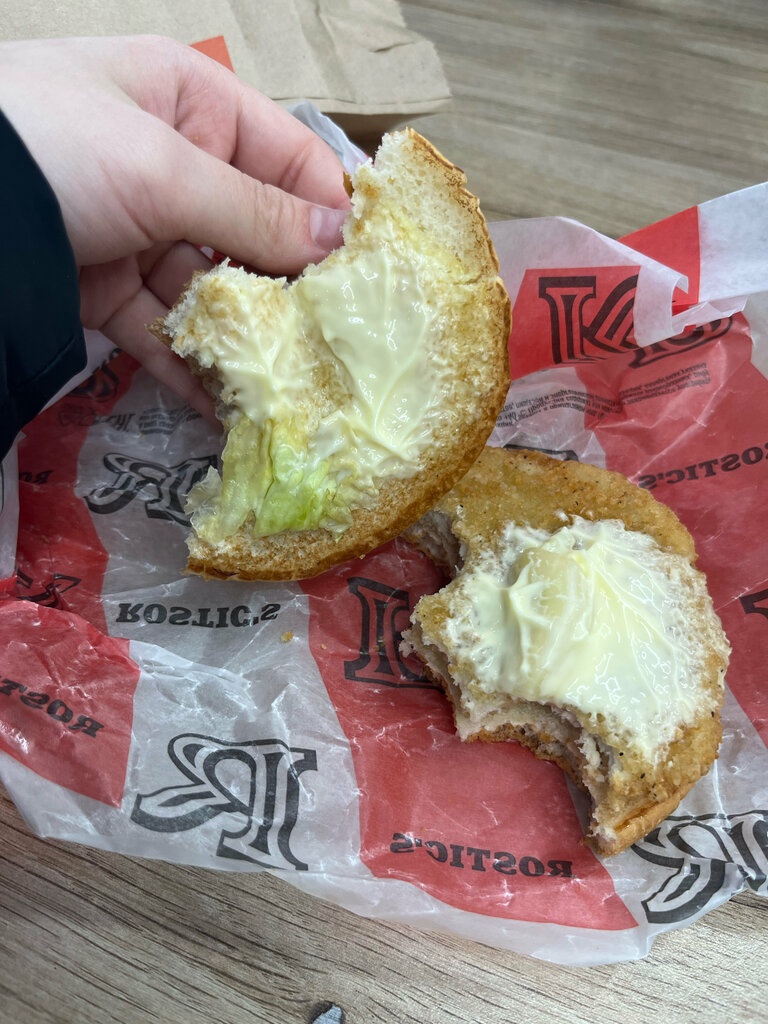 Всем совет,когда забираете свой заказ обязательно проверяйте,заказывали раз 8-9,только один раз собрали все как должно быть,то стрипса не доложат,то соуса,то вообще картошки всей Это было бы пол беды,но сегодня произошел вопиющий случай,который мне к сожалению не объяснить,заказали с девушкой заказ в 21:52,заказ был большой,достаточно много курицы,но сказали что курицы нет и готовить нам ничего не будут,нам объяснили это тем чтобы остатка после закрытия не оставалось,но зная как работает во всех фастфудах(сам работал),звучит его отговорка как бред какой то,скорее всего знали что придется на минуты 2-3 задержаться и работать не хотелось Да это одна из многих отрицательных ситуаций в этой точке Rostc’s Были ситуации когда со мной спорила женщина что положила все правильно,поднимая голос,когда я никогда не кричу и не хамлю сотрудникам ни одного общепита,потом оказалась что она была не права и выдавала заказ снова с яростными глазами Ставлю 2 бала,по еде норм