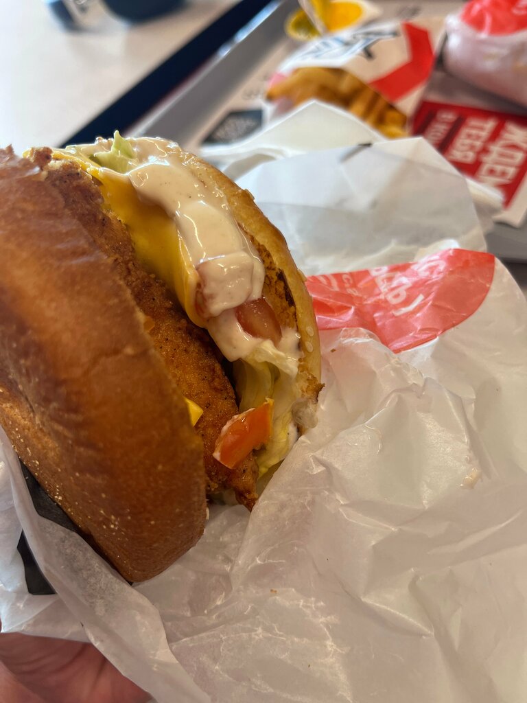 Хочу поделиться впечатлениями о данном «Ростиксе» на Окружной. Для начала отмечу главное: это, по сути, единственное место во всём районе, где можно более-менее культурно посидеть. Из очевидных плюсов: 1. Здесь большой зал, и по сравнению с другими филиалами сети довольно тихо. 2. Заказы, как правило, готовят быстро, в срок до 10 минут, что соответствует норме. 3. Персонал очень приятный. Бывали случаи, когда в заказе забывали положить какую-нибудь позицию, но на выдаче всегда извинялись и всё исправляли. Хочется их поблагодарить за работу. Однако есть и существенные минусы: 1. Большинство посадочных мест это не диваны, а стулья или жёсткие деревянные лавки, что не очень комфортно. 2. Так как это единственная точка, где можно присесть, сюда постоянно заходит много подростков. Среди них есть и воспитанные, которые тихо отдыхают, и невоспитанные, которые ведут себя вызывающе, нагло и могут мешать другим посетителям. В целом, это неплохое место, где можно перекусить. Несмотря на постоянный поток посетителей, очень редко бывает полная посадка, и место найти можно почти всегда.