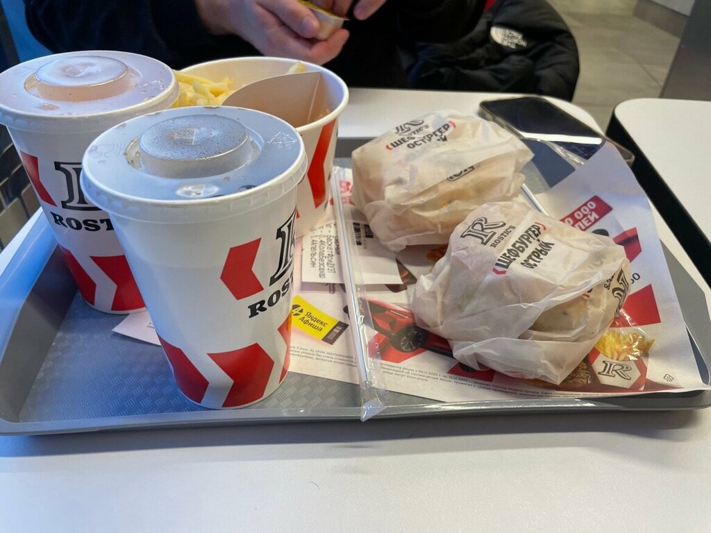 Пришлось побывать в данном заведении. При входе сразу бросается в глаза зал, который не убирается, а "строгие санитарно-гигиенические нормы и стандарты работы" не контролируются регулярными проверками. Также на столах оставлена пища прошлых посетителей. Заказали на терминале, так как на кассе никого не было. Любимых блюд, за которые так полюбился ростикс, не было. Даже кофе нет. Зачем открываться, ежели кофемашины отсутствуют. Ожидание составило 40 минут. Классическое ожидание, судя по отзывам. Благо работники извинились. Из персонала работало 2 человека, трудящиеся в поте лица. Наггетсы были приготовлены не по "стандартам работы", чувствовалось, что размораживались. Остальные позиции были как обычно. Доводилось бывать в нескольких ростиксах. Поэтому этот отстающий. Не рекомендую.