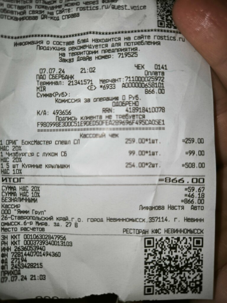 Именно это место не понравилось, а так «Ростикс» очень нравится. Заезд очень неудобный. Экран, где заказывать еду, почти не работал, нужно было очень медленно передвигаться по меню, чтобы случайно не нажать куда-либо, он был вообще неуправляемым, видимо, какой-то старый, потому что в другом городе всё было очень легко, просто и быстро. Людей было немного, почти все места свободные, но заказ мы ждали больше 20 минут. Мы торопились, и нам очень не понравилось такое большое ожидание. Быстрое питание оказалось нифига не быстрым. Из-за ожидания пропало настроение, и вкус еды был уже не важен, лишь бы поскорее поесть и поехать дальше, но было вкусно, жаль, что впечатление испортилось. Булочка у бургера была разломанная. Заказали большое кофе 400 миллилитров, после того как размешали сахар в нем, поняли, что половина стакана занимает просто пена, которая потом пропала, и половина стакана была уже пустой. Цены нормальные, кроме холодных напитков, за две колы отдали 350 рублей. Всё остальное в норме.