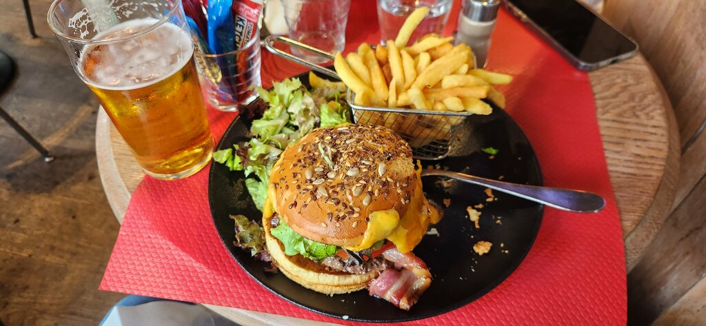We stopped for a snack and waited out the rain while walking through the center of Paris. An ordinary Parisian cafe. A passable Caesar salad and a burger. The standard selection of wine and beer. In general, you can run in for a snack, but no more.