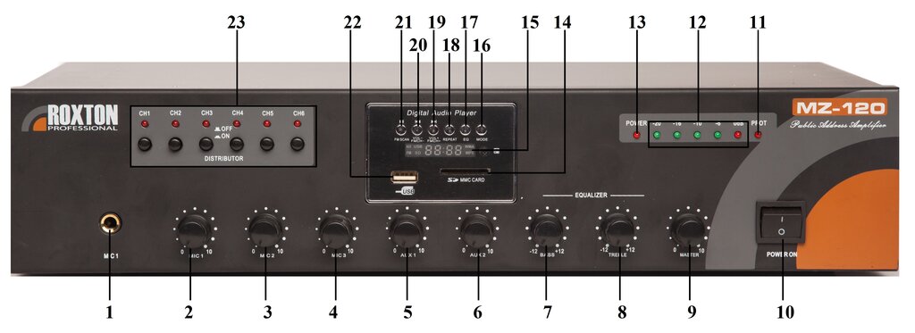 ROXTON MX-120 - USB-проигрыватель-тюнер-усилитель 120 Вт, 3 микрофонных и 3 универсальных входа, 5 зон, работа с ROXTON RM-05. Особенности усилителя: Шесть микрофонных или линейных входов с Phone, XLR и RCA разъемами Широкий входной диапазон RJ...